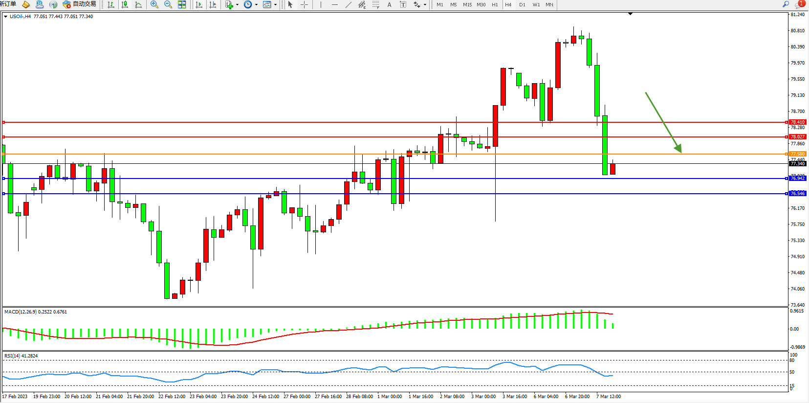 交易策略:77.580下方看跌,目标76.942 76.546