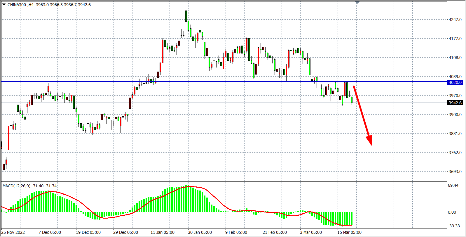 4小时图看,沪深300在4020之下继续走弱,压力再度显现,同时MACD于零轴之下量能依旧较大,显示空头动能仍强劲,阻力关注4020,日内在4020之下继续看跌,下方目标3900-3850附近。