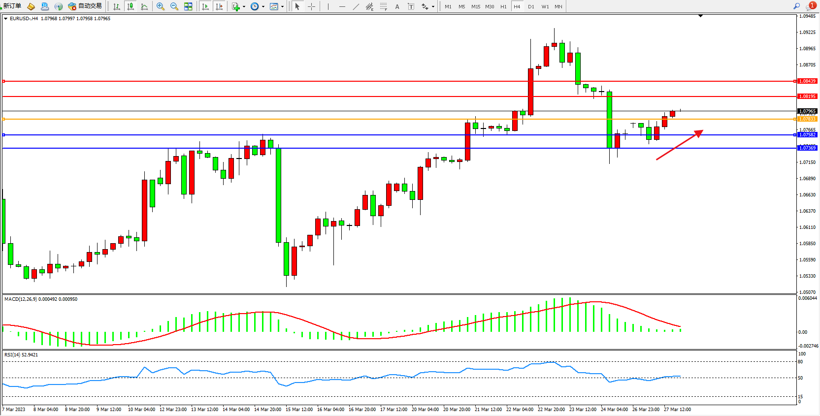 欧元美元EURUSD—4小时K线图显示: