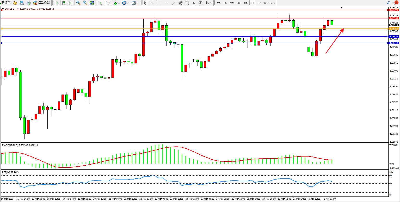 4小时图看:高位多头动力呈V型反转上移,短期看涨情绪依旧看,市场多头动力不断向上移动中,MACD指标处于0轴线上側徘徊,RSI指标处于50均衡线上側弱势震荡;