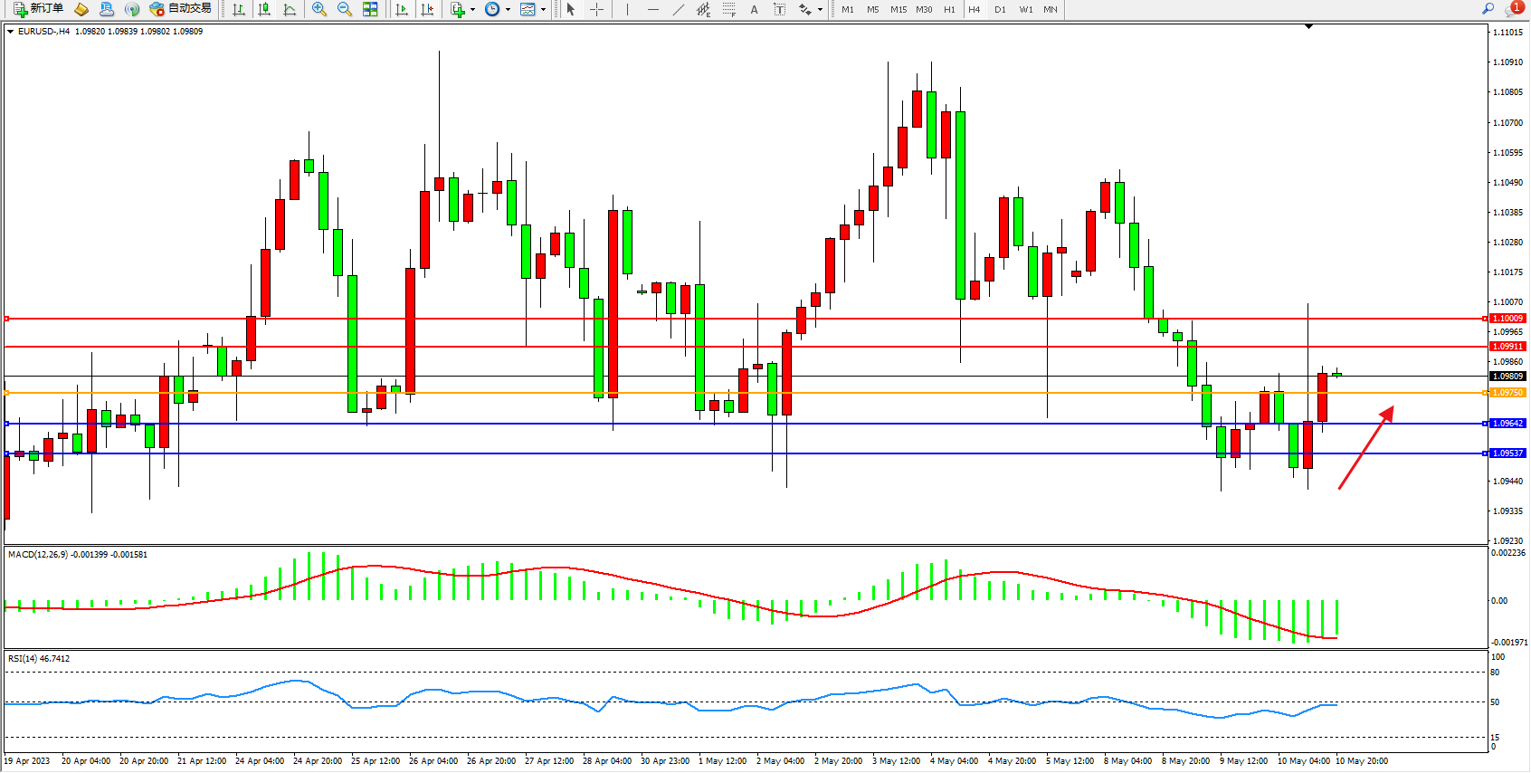 欧元美元EURUSD—4小时K线图显示:
