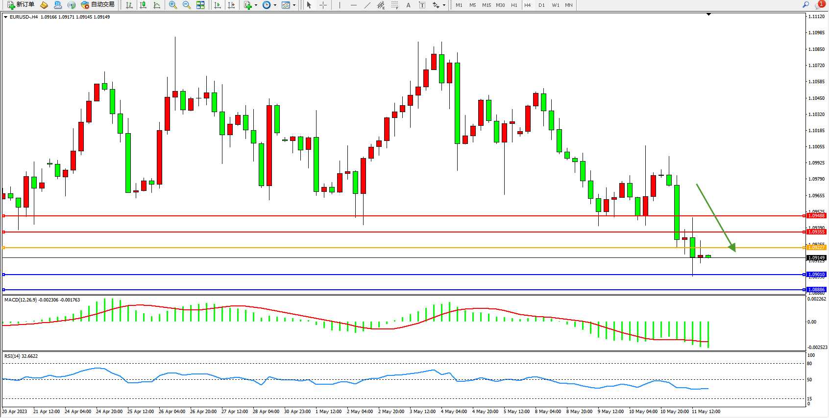 欧元美元EURUSD—4小时K线图显示: