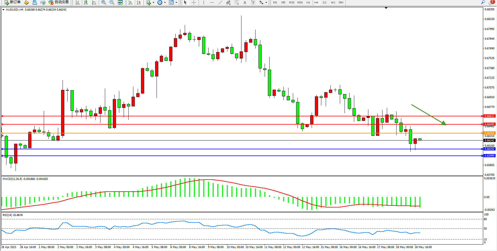 澳元兑美元维持0.66242附近震荡,澳大利亚4月就业报告出人意料地表现不佳,失业率从3月的3.5%上升至3.7%。市场预计澳洲联储将再次加息25个基点,但加息时间将从6月推迟到8月。