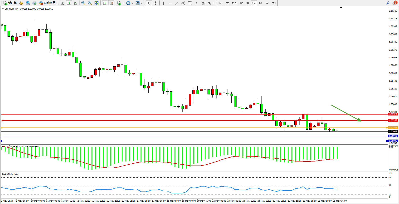 欧元美元EURUSD—4小时K线图显示: