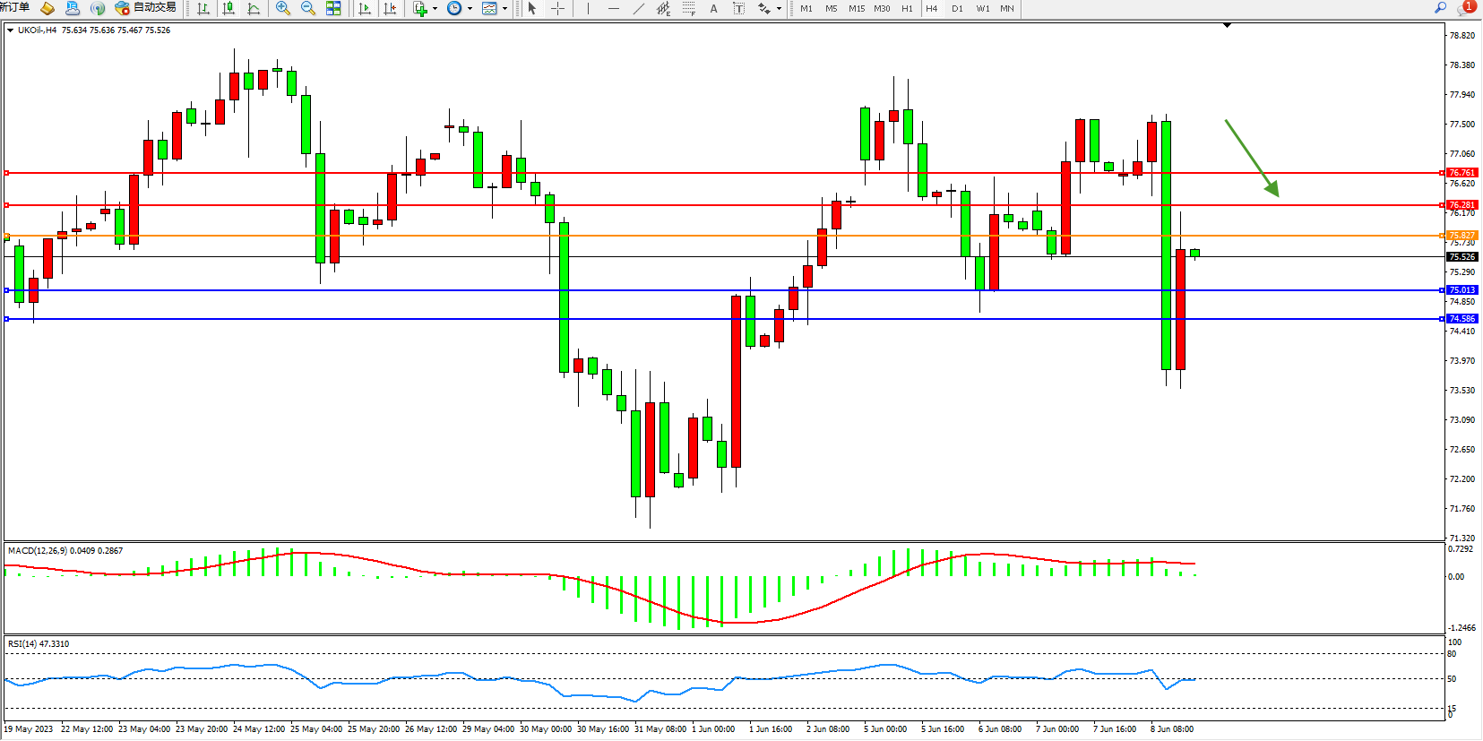 布油维持75.526附近震荡,油价最近一直试图复苏,但很艰难。供应趋紧但需求前景疲软,可能会继续使油价保持在年初以来的宽幅区间内,布伦特原油的直接阻力位在80美元水平。