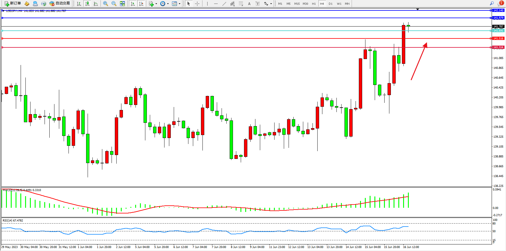 4小时图看:高位强势上扬,短期看涨情绪持续,市场多头不断攀升中,MACD指标处于多头区域高位上移,RSI指标处于多头区域震荡;