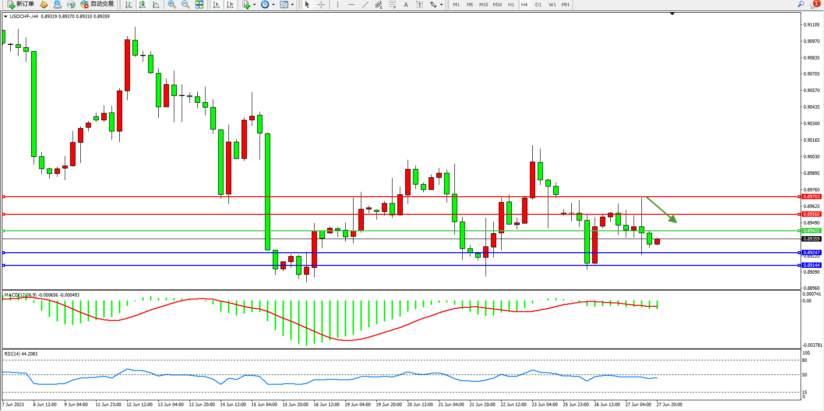 交易策略:0.89422下方看跌,目标0.89247  0.89144