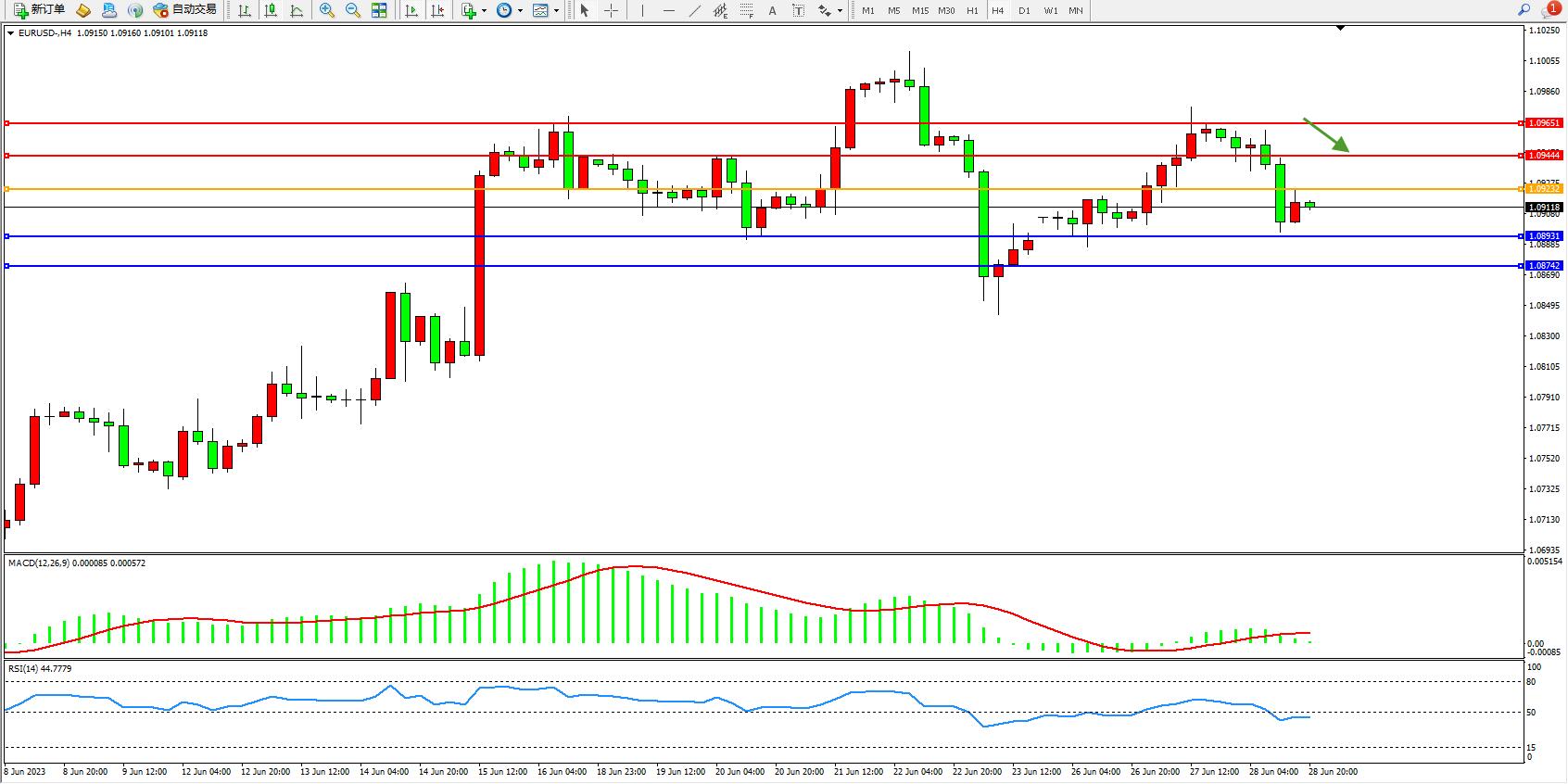 4小时图看:高位空头动力维持震荡下移,短期跌势或将延续,市场整体偏空头走势中,MACD指标处于0轴线上側徘徊,RSI指标处于50均衡线下侧弱势整理;