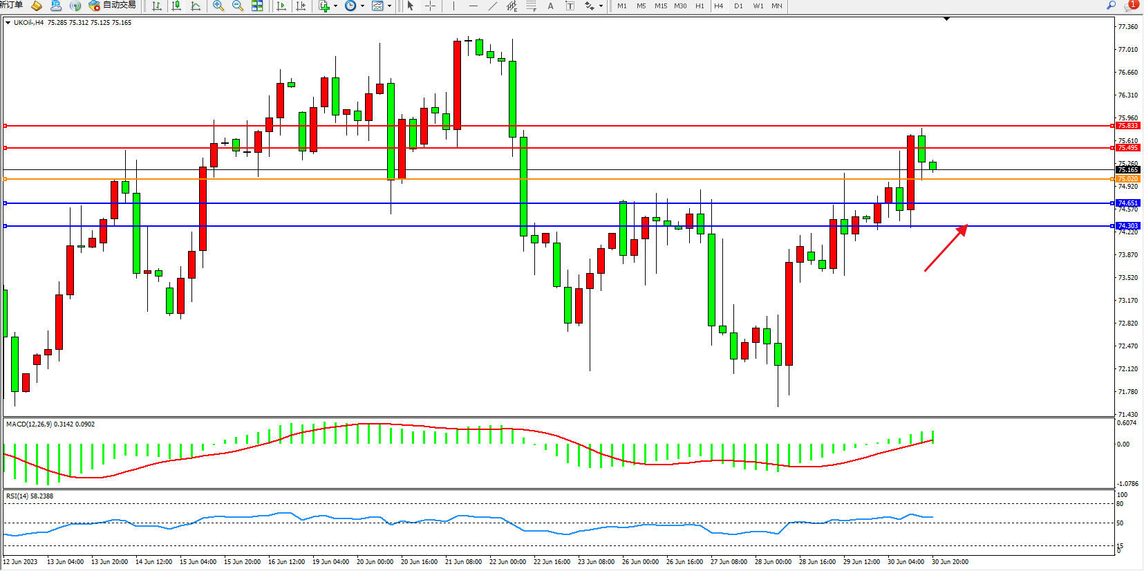 布油维持75.165附近震荡,汇丰银行下调布伦特原油价格预期:2023财年下半年为80美元/桶,2023财年全年为80美元/桶,2024财年为75美元/桶,长期预期为75美元/桶。长期加息的持久影响可能会对2024年后的石油需求产生负面影响。
