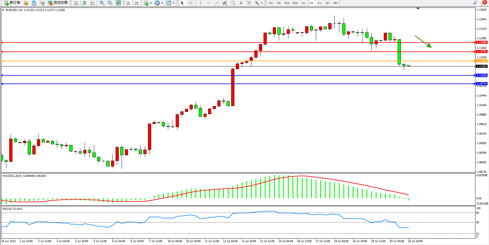 欧元美元EURUSD—4小时K线图显示: