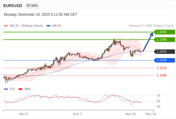 在 1.1530 之上,看涨,目标价位为 1.1585 ,然后为 1.1605 。
