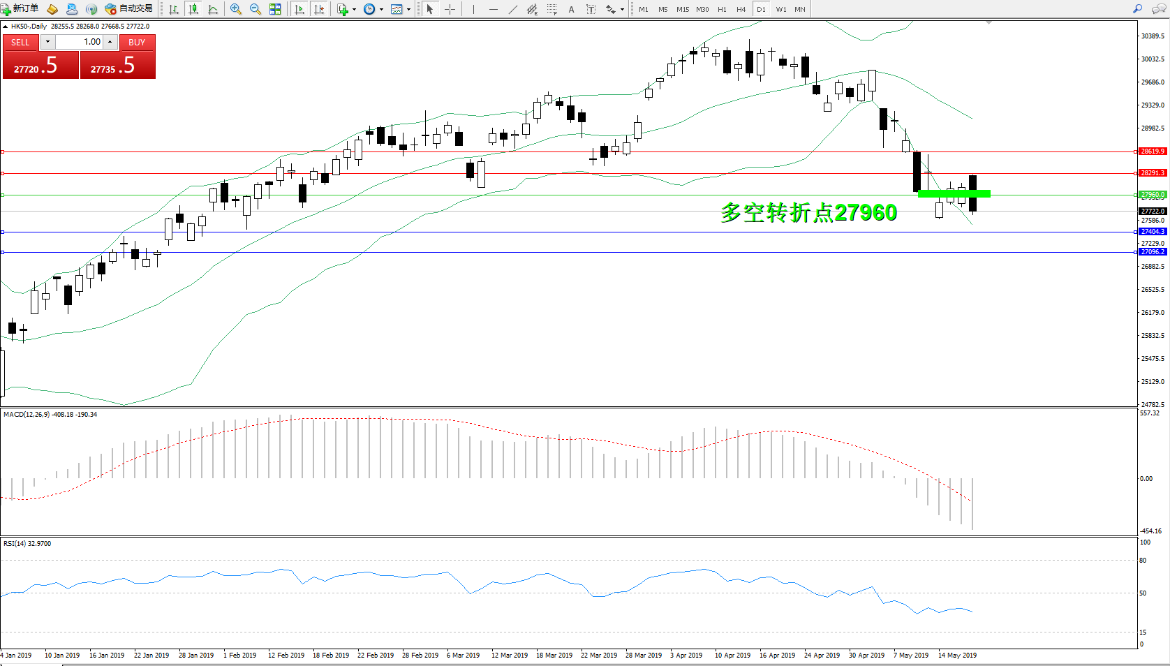 香港恒生指数小幅高开后一路走低,跌1.16%,报27946.46点,周线跌2.09%。华为启动“备胎”计划,内地相关概念股强劲反弹。一些市场参与者猜测,这些股票之所以上涨,还因为投资者认为,华盛顿对中国华为的强硬立场有望给这些企业带来暴利。华为目前是这些企业最强劲的竞争对手。