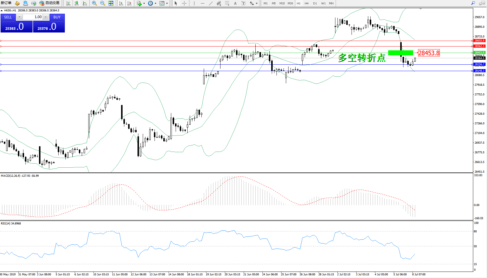 香港恒生指数7月8日(周一)收盘下跌443.14点,跌幅1.54%,报28331.69点;恒指大市成交额报757.05亿港元(上一交易日成交额为562.22亿港元)。外围市场严重影响恒指走势,多只个股暴跌,承兴国际控股一度跌90%。上证指数一度杀跌超过90点,跌幅亦超3%。A股半日蒸发1.55万亿。恒指波动区间为25000点-32000点,建议寻找中小防御性标的,下半年港股还要继续跨越多层“忧虑之墙”,其前景仍然不太明朗。