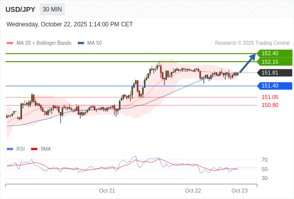 在 151.40 之上,看涨,目标价位为 152.15 ,然后为 152.40 。