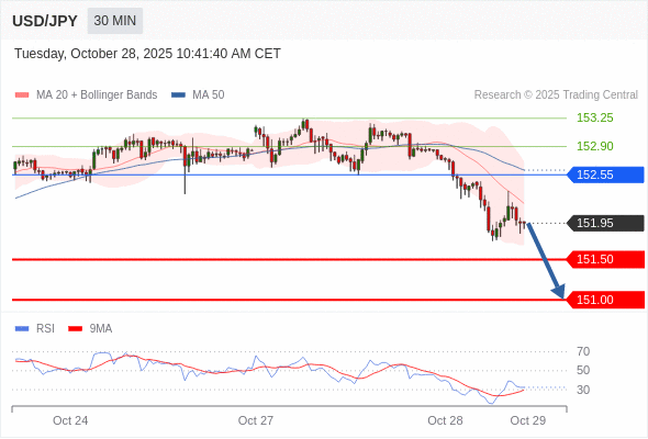 在 152.55 之下,看跌,目标价位为 151.50 ,然后为 151.00 。