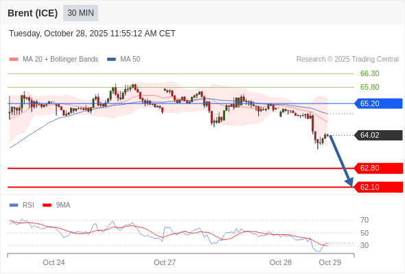 在 65.20 之下,看跌,目标价位为 62.80 ,然后为 62.10 。