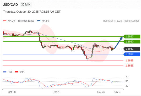 在 1.3910 之上,看涨,目标价位为 1.3960 ,然后为 1.3980 。