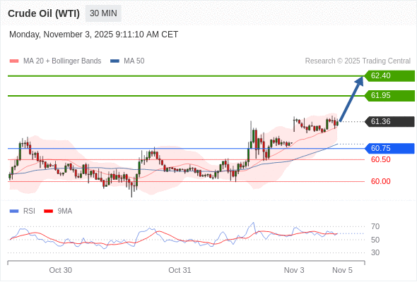 在 60.75 之上,看涨,目标价位为 61.95 ,然后为 62.40 。