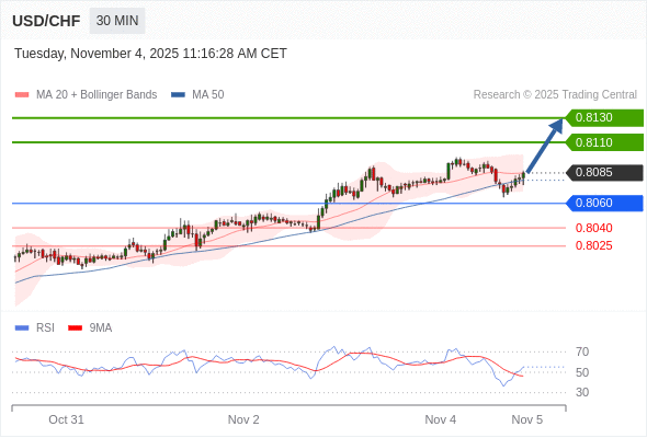 美元/瑞郎 当日内: 在0.8060之上,看涨。