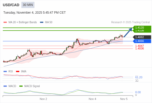 美元/加元 当日内 : 看涨,当 1.4066 为支撑位。