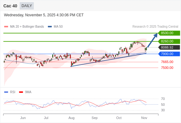 Cac 40 短线: 被上升趋势线支撑。