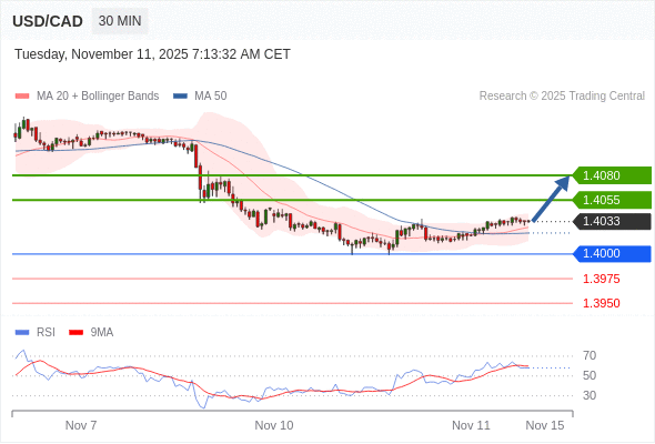 在 1.4000 之上,看涨,目标价位为 1.4055 ,然后为 1.4080 。