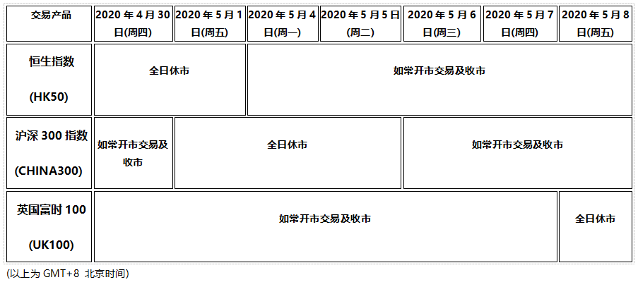 2020年4月30日(周四)至5月5日(周二)为香港佛诞日假期和国际劳动节假期, 5月8日(周五)为英国银行假期,以下产品的交易时间将于各自市场假期期间全日休市,敬请阁下留意知悉!