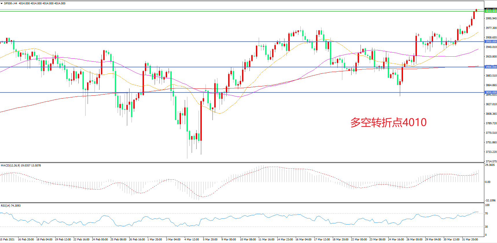 周四(4月1日),拜登公布逾2万亿美元的基建和经济复苏计划,美国3月ISM制造业指数创37年新高,市场更看好全球经济复苏的前景,长期美债收益率大幅下降为市场提供上行环境,标普500大幅拉升,收报4014点,再创历史新高。今日是耶稣受难日,欧美金融市场休市,美股市场将休市一天。