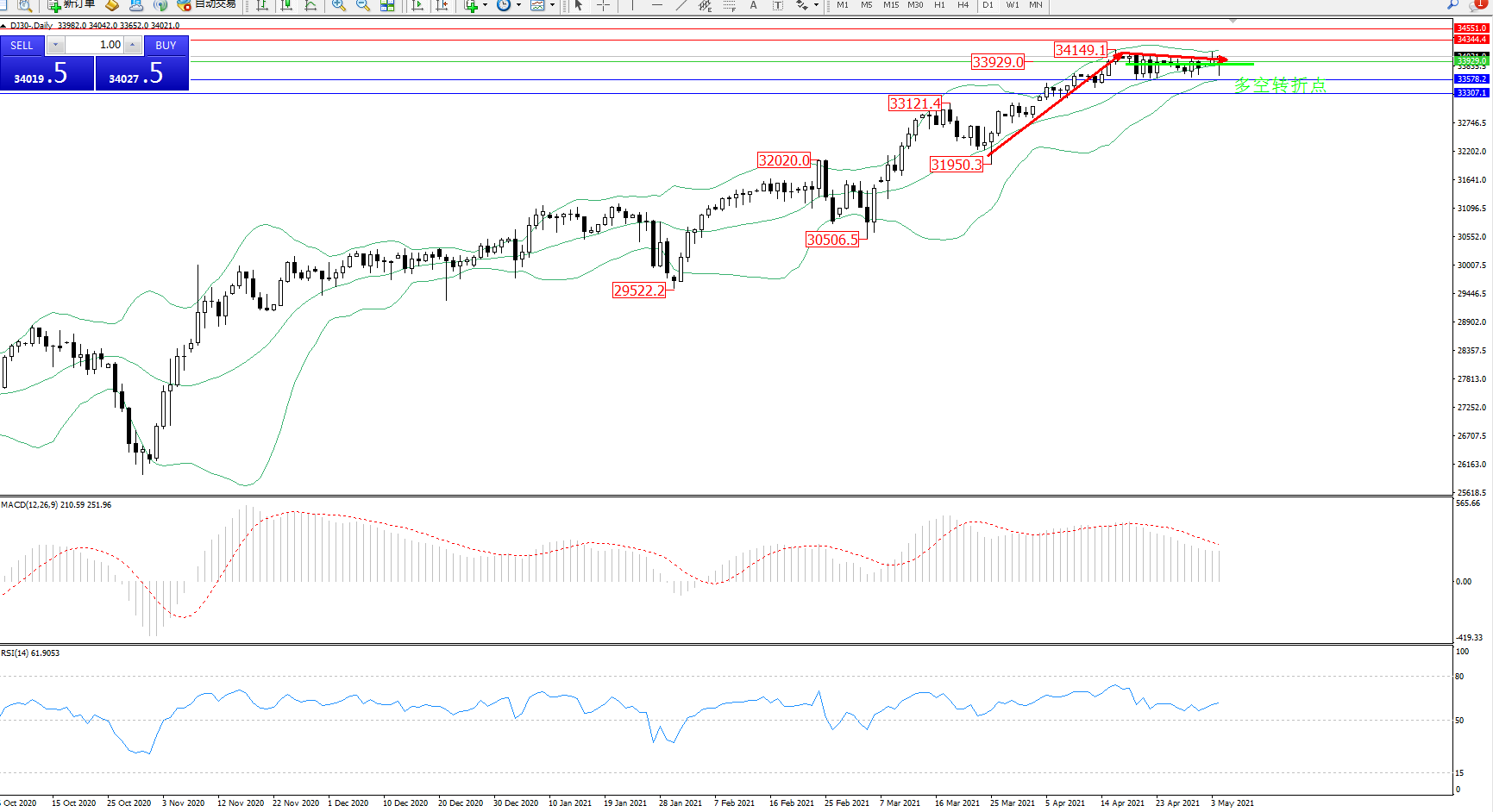 道琼斯指数5月4日(周二)收盘上涨22.11点,涨幅0.06%,报34135.34点;美股三大指数收盘涨跌不一,由于一些全球最大的科技公司的股票遭到抛售,拖累股市下跌,金融市场周二陷入动荡。数据显示3月份美国的贸易逆差扩大至历史新高。美国财政部长耶伦表示利率在某个时间可能必须温和上升以免经济过热。在股市估值水平维持在接近二十年最高点之际,耶伦的言论使人们对政府支出是否会刺激通货膨胀的辩论更加激烈。对冲基金一段时间以来在以金融危机以来从未有过的速度卖出股票,尽管业绩表现出色,但股市近来却难以持续上涨。在最近的上涨引发了对泡沫的猜测之后,耶伦关于美联储可能不得不加息的说法足以促使投资者选择离场。