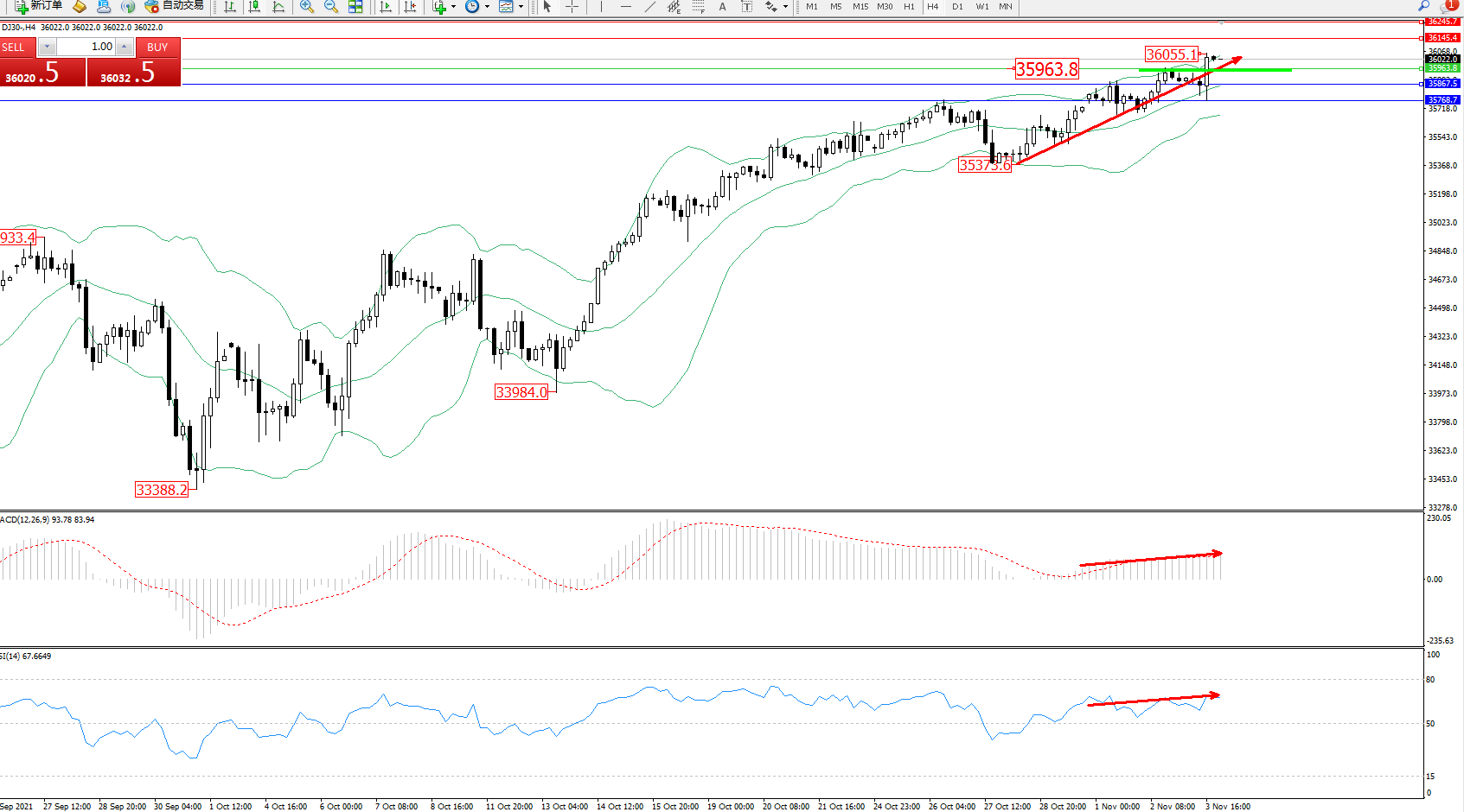 道琼斯指数DJ30——4小时K线图显示: