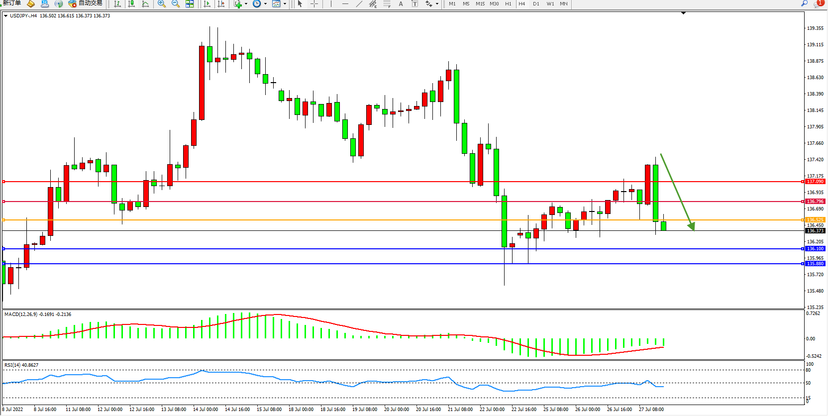 交易策略:136.525下方看跌,目标136.100、135.880