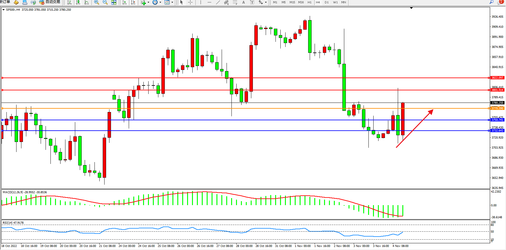 标普500指数11月4日(周五)收盘上涨51.51点,涨幅1.38%,报3771.40点;美国10月新增非农就业26.10万人,好于预期的20万,在这份报告发布之前,美联储加息75个基点的可能性为60%,剩余的可能性为加息50个基点。之后加息75个基点概率上升到64%。非农就业人数持续升温。失业率的上升是明显的,但它来自较低的参与率。