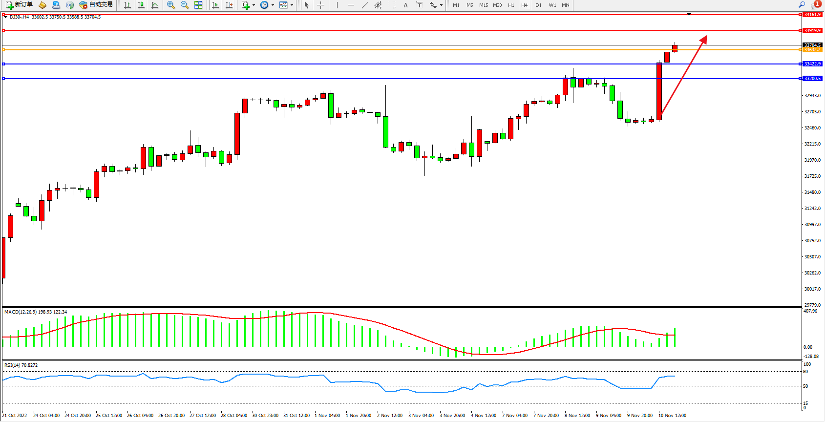 道琼斯指数11月10日(周四)收盘上涨1201.43点,涨幅3.70%,报33715.37点;美国10月未季调CPI年率录得7.7%,时隔7个月再度回落至8%以下,为2022年1月以来最小增幅。美国通胀已经是俄乌冲突前的低位了,但明显这对美联储来说,通胀仍然过热。