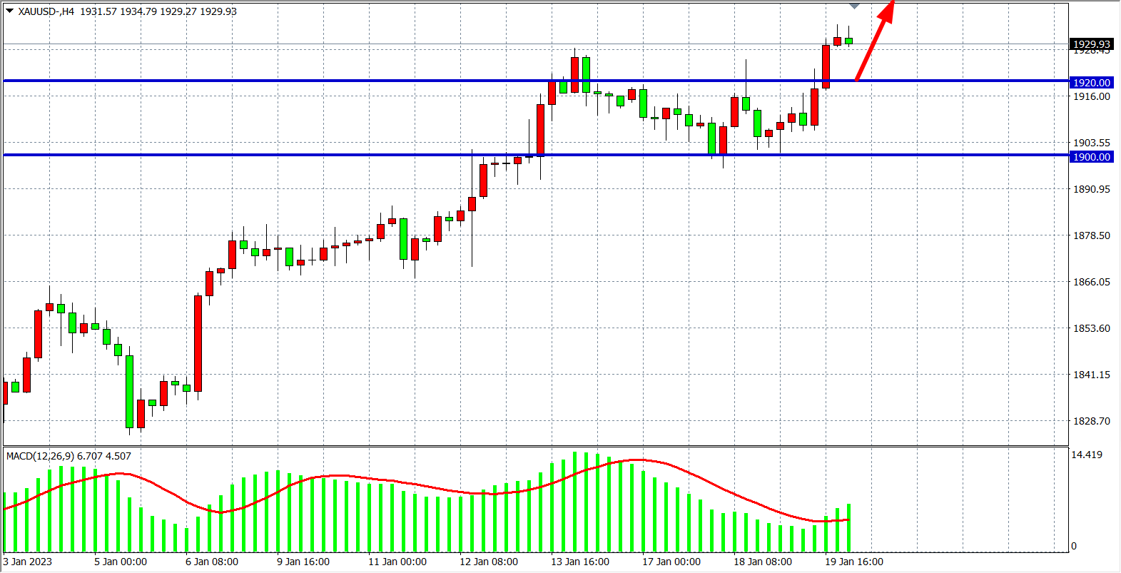 4小时图看,金价在1900之上继续走强,MACD量能在零轴之上量能也开始重新释放,显示行情有进一步走高的空间,当前支撑上移1920附近,在1920之上继续看涨,目标1930-1950附近。