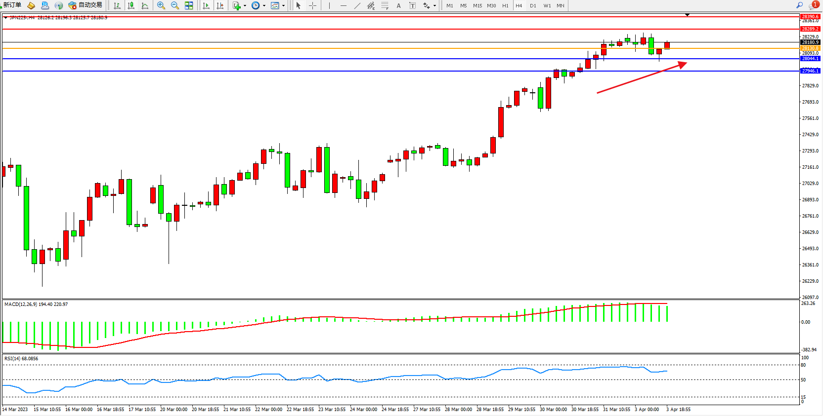 4小时图看:多头动力持续震荡上扬后,高位窄幅整理,市场看涨情绪依旧,MACD指标处于多头区域高位偏好,RSI指标处于多头区域高位整理;