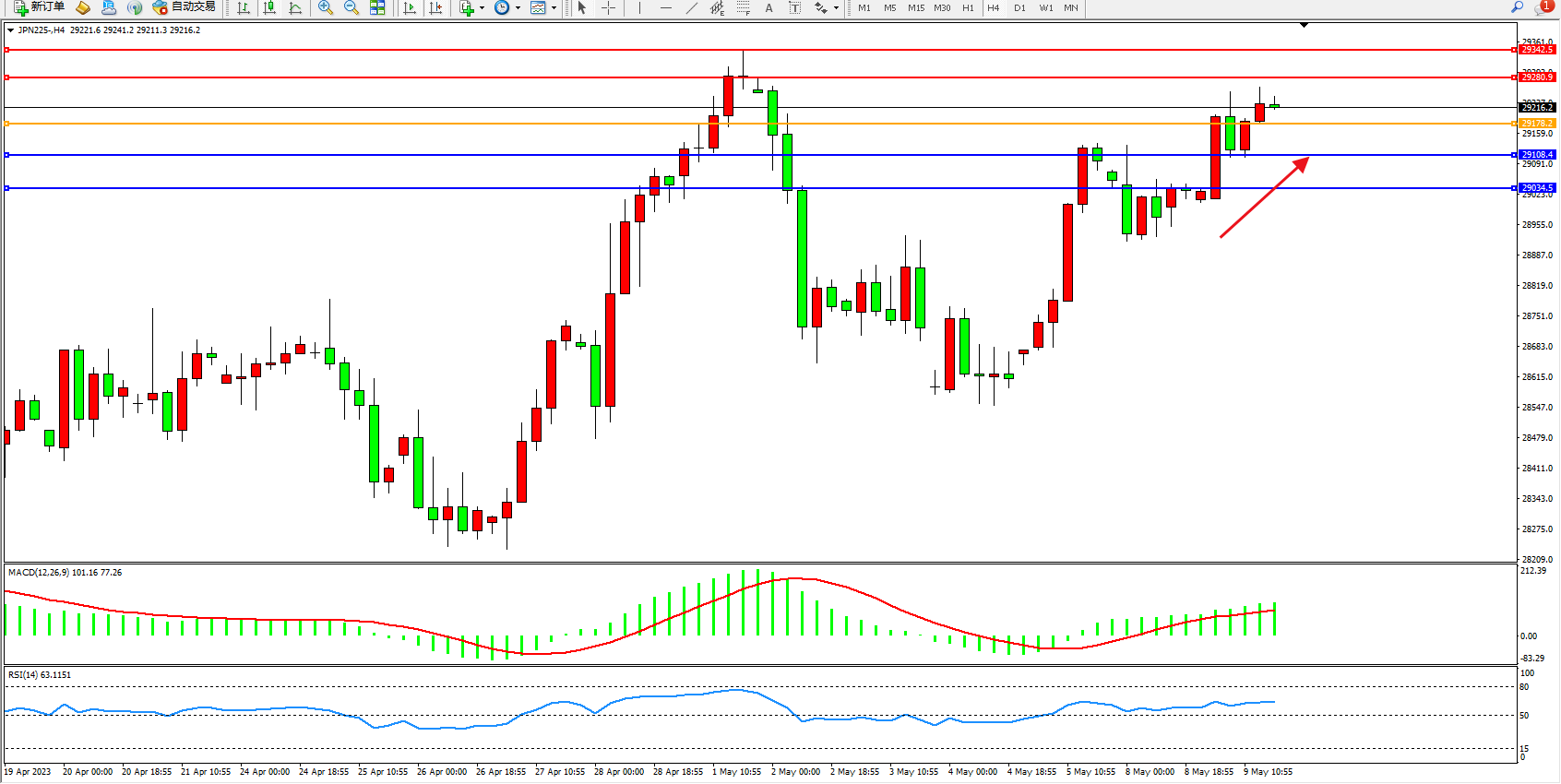 4小时图看:多头动力高位上扬,短期看涨情绪依旧,市场多头动力不断拉升,即将突破前期高位节点,MACD指标处于多头区域整理,RSI指标处于50均衡线上側弱势整理;
